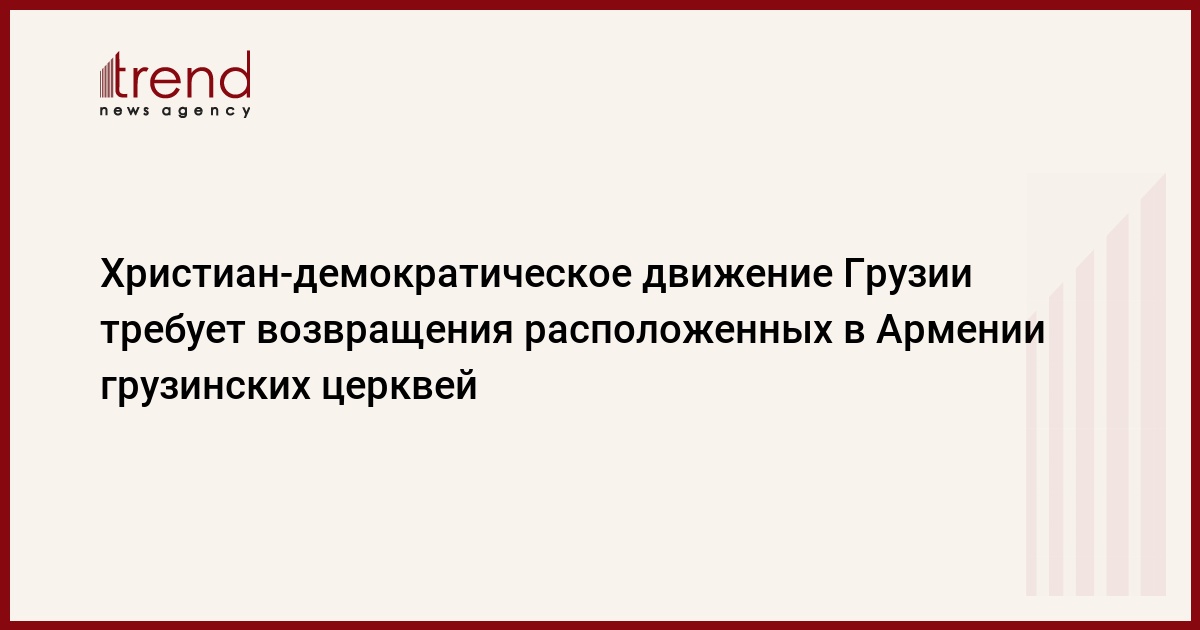 Грузия, Тбилиси, 10 декабря /корр. Trend Н.Кирцхалиа/ В четверг, в 14:00, Христиан-демократическое движение Грузии проведет акцию у посольства Армении. Акция проводится с требованием возвращения грузинских церквей-монастырей, расположенных в Армении, сказал лидер движения Гиорги Андриадзе. Национал-христиане призывают общественность поддержать их.