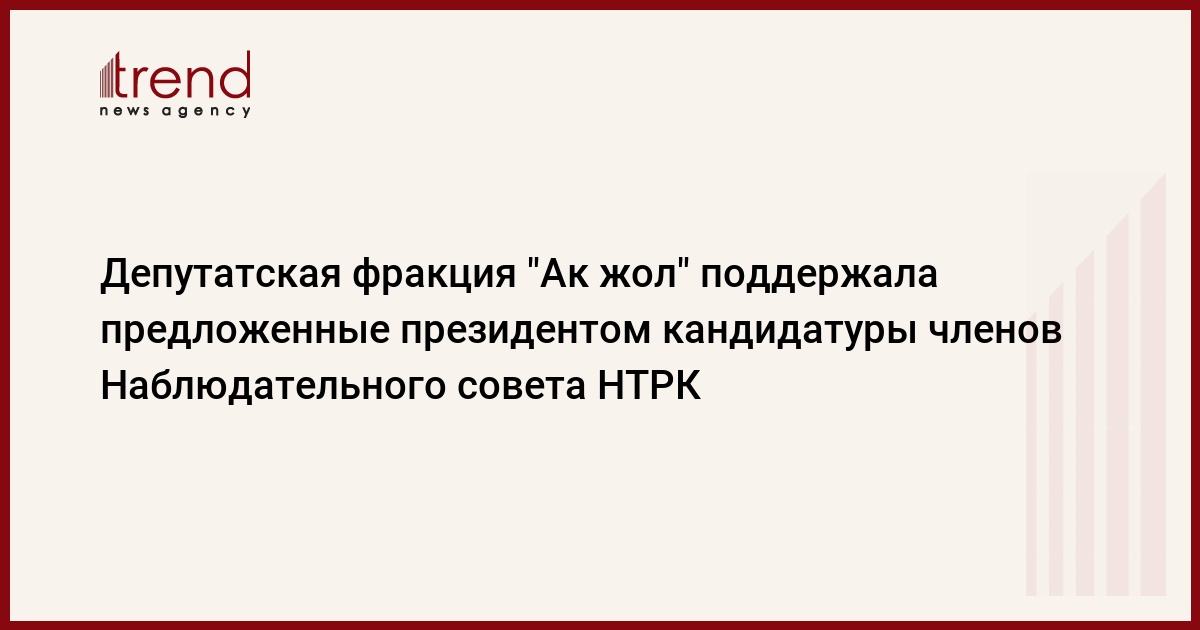 Кыргызстан, Бишкек, 10 декабря /корр. Trend Р.Мешадигасанлы/ Депутатская фракция "Ак жол" единогласно поддержала представленные президентом кандидатуры членов Наблюдательного совета Национальной телерадиовещательной корпорации (НТРК), сказал Trend сегодня сотрудник пресс-служб парламента Кыргызстана Мелис Эржигитов.