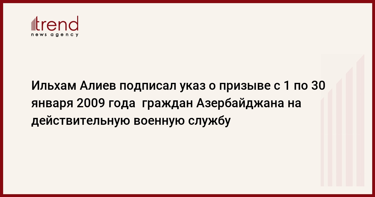 Президент Азербайджана Ильхам Алиев подписал указ о призыве с 1 по 30 января 2009 года граждан Азербайджана на действительную военную службу и об увольнении в запас военнослужащих-срочников. Данную информацию распространило агентство Азертадж.
