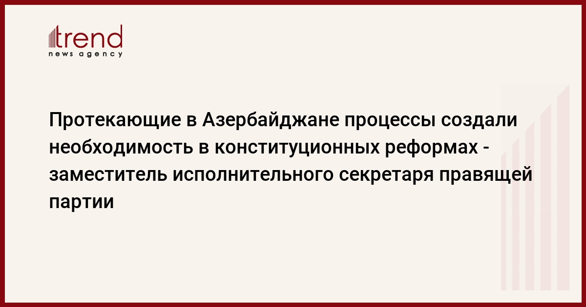 "Протекающие с момента принятия Конституции АР процессы в экономическо-политической жизни в мире в целом, и в Азербайджане создали необходимость в конституционных реформах. В связи с этим на повестку был внесен вопрос о дополнениях и изменениях в проект Конституции, состоящий из 29 статей", - сказал Trend в пятницу заместитель исполнительного секретаря правящей ПЕА, депутат Сиявуш Новрузов.