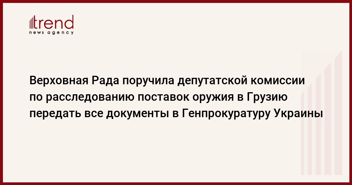 Украина, Киев, 19 декабря /корр. Trend З.Новсвитский/ Верховная Рада сегодня поручила временной следственной комиссии (ВСК) по вопросам выяснения обстоятельств поставки в Грузию украинской военной техники, с целью установления фактов нарушения законодательства Украины и норм международного права, передать Генеральной прокуратуре все документы для соответствующего реагирования на них.