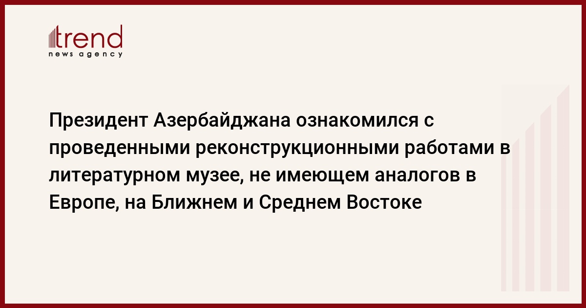 После ознакомления с музеем глава государства оставил запись в памятной книге: "Начало деятельности Музея азербайджанской литературы имени Низами Гянджеви после капитального ремонта является очень значимым событием в истории современного Азербайджана. Демонстрируемые в музее экспонаты и произведения искусства свидетельствуют о богатой культуре азербайджанского народа. Желаю новых достижений всем сотрудникам музея".