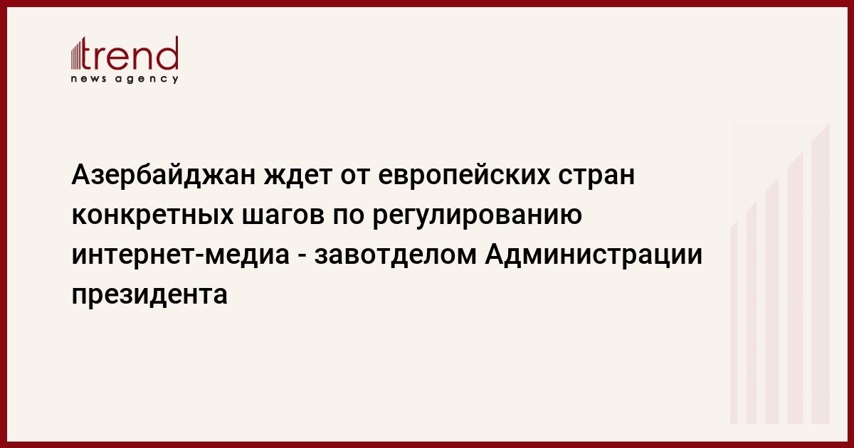 Азербайджан ждет конкретных шагов от европейских стран в сфере регулирования интернет-медиа, сказал в четверг глава общественно-политического отдела Администрации президента Али Гасанов на конференции "Регулирование интернет-медиа в Азербайджане", организованном Советом Европы и Национальным советом телевидения и радио Азербайджана.