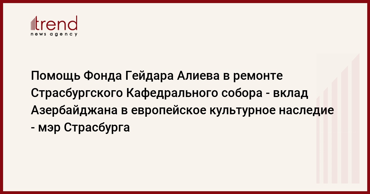 Материальная помощь, предоставленная Фондом Гейдара Алиева на ремонт Страсбургского Кафедрального собора, является вкладом Азербайджана в культурное наследие Европы. Такое мнение высказал мэр Страсбурга Ролан Рис (Rolan Ries) на состоявшейся в понедельник в этом городе официальной презентации помощи Фонда Гейдара Алиева в реставрации городского кафедрального собора.