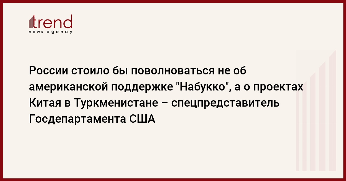Американский дипломат также сказал, что России стоило бы поволноваться не о том, что США поддерживают проект "Набукко", а о проектах, осуществляемых Китаем в Туркменистане.