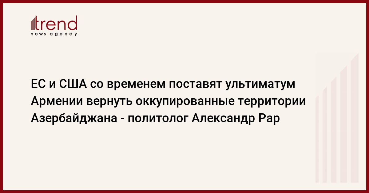 "Если ЕС и США действительно хотят иметь геополитическое влияние в регионе, они не могут поддерживать только одну сторону нагорно-карабахского конфликта, - сказал Trend по телефону из Берлина Рар. - Я уверен, что армянам фактически поставят ультиматум вернуть для начала оккупированные территории Азербайджана. Это даже не вызывает вопросов, и сам Ереван понимает, что нужно вернуть земли".