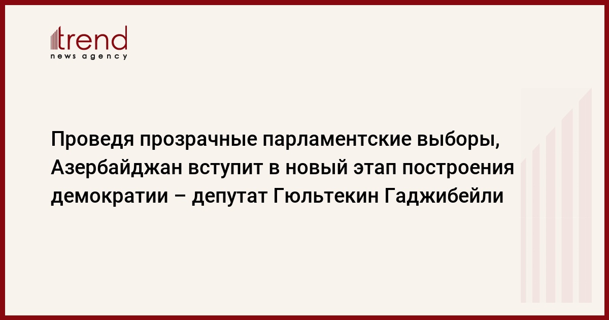 "Проведя более прозрачные и демократические выборы, Азербайджан на самом деле вступит в новый этап построения демократии", - сказала в четверг заместитель председателя комитета по международным отношениям и межпарламентских связей Милли Меджлиса (парламента Азербайджана) Гюльтекин Гаджибейли.