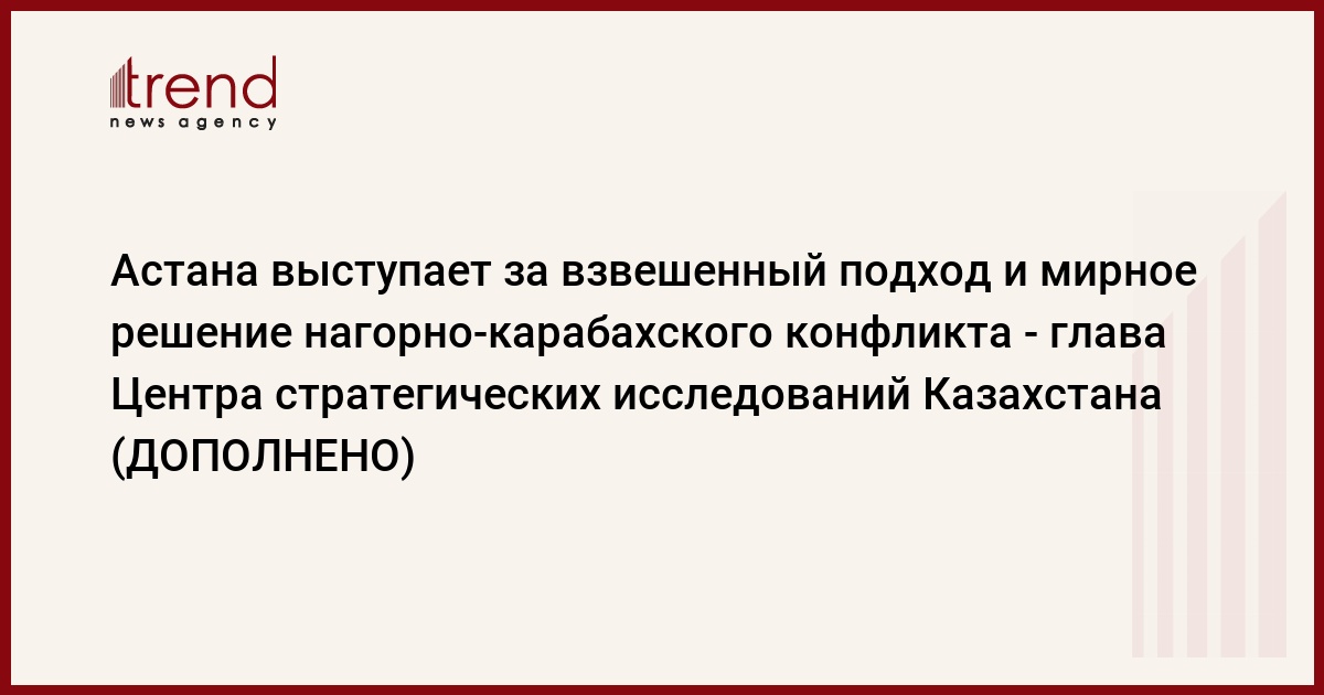 Казахстан выступает за взвешенный подход и мирное решение армяно-азербайджанского нагорно-карабахского конфликта, сказал в понедельник в ходе заседания в формате "круглого стола" в Баку директор Центра стратегических исследований Казахстана Булат Султанов.