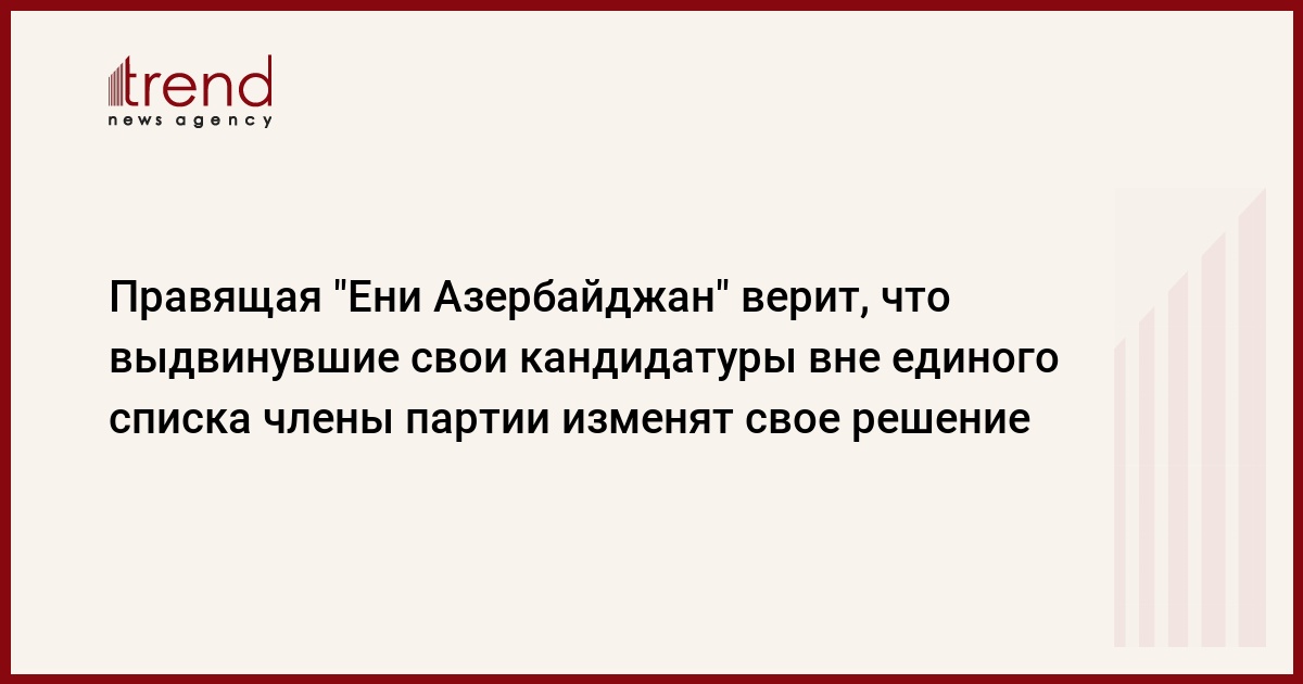 Зампредседателя правящей партии "Ени Азербайджан" (ПЕА) выразил уверенность, что члены ПЕА, выдвинувшие свои кандидатуры вне единого списка кандидатов от партии, изменят свое решение.