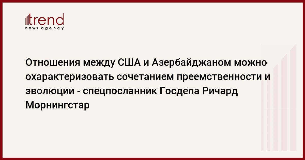 Отношения между США и Азербайджаном можно охарактеризовать сочетанием преемственности и эволюции, сказал специальный посланник Госдепартамента США по вопросам евразийской энергетики Ричард Морнингстар (Richard Morningstar), выступая на конференции "Американо-азербайджанские отношения: состояние "стратегического партнерства", во вторник в Вашингтоне.