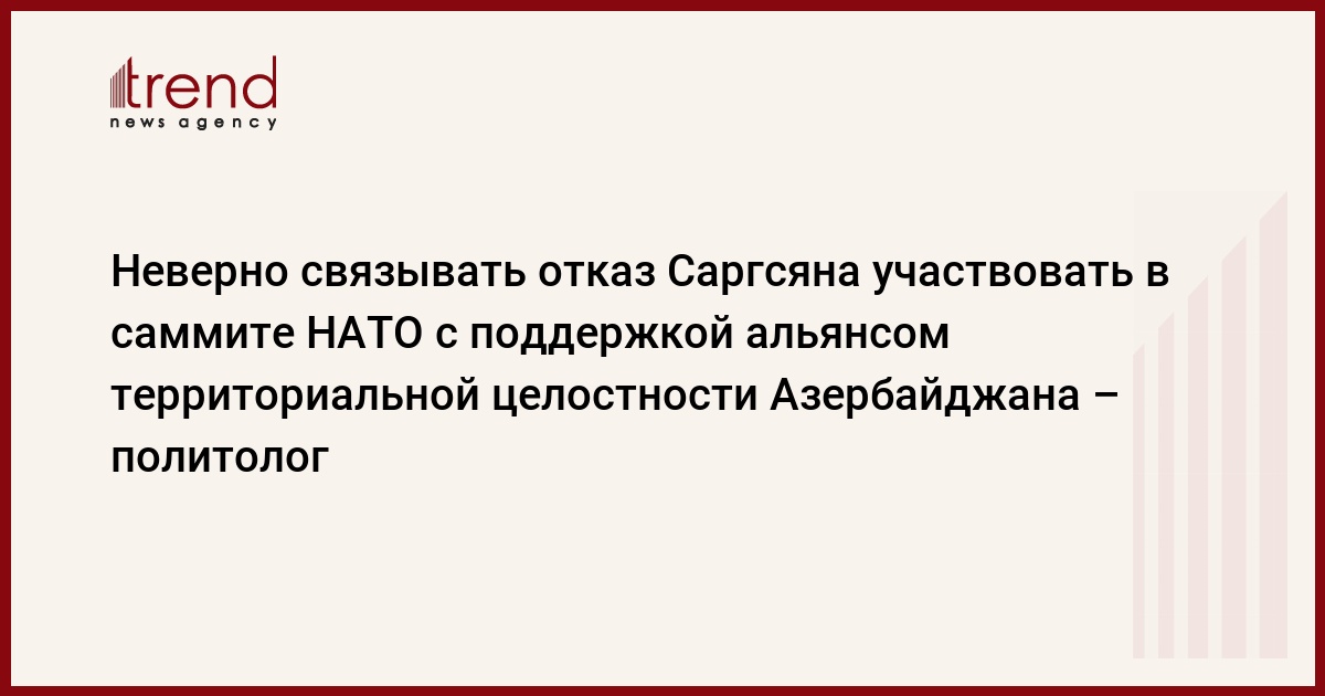 Неверно связывать отказ Сержа Саргсяна от участия в саммите НАТО с поддержкой альянсом территориальной целостности Азербайджана, сказал в понедельник Trend директор Центра политических инноваций и технологий, политолог Мубариз Ахмедоглу.