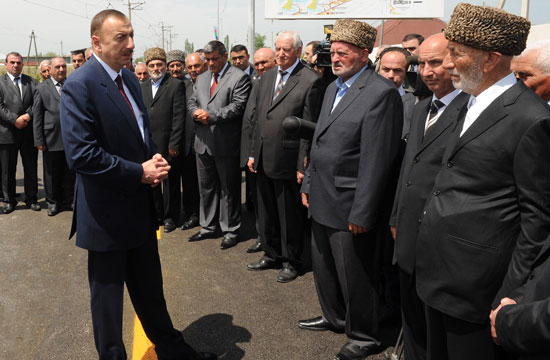 Житель: Дорогой наш Президент, наши люди тоже пользуются этой дорогой. Наше село тоже является одним из тех саатлинских сел, которые остались под водой во время прошлогоднего бедствия. Дома в нашем селе были построены из сырого кирпича. Сейчас, слава Аллаху, с Вашей помощью строятся прочные каменные дома. Всем людям выплачена компенсация. Сегодня наши жители могут спокойно спать в своих домах. Наши дамбы укреплены, мы больше ни о чем не беспокоимся. Можно сказать, что все наши проблемы, в том числе проблемы, связанные с водой, решены.