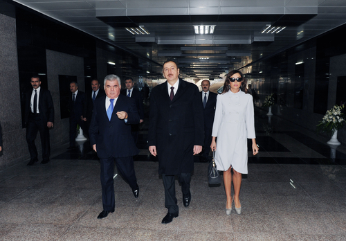 Президент Ильхам Алиев и его супруга Мехрибан Алиева сначала приняли участие в открытии подземного перехода, построенного перед Морским вокзалом на проспекте Нефтяников.