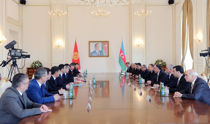 По завершении встречи один на один в пятницу состоялась встреча Президента Азербайджана Ильхама Алиева и Президента Кыргызстана Алмазбека Атамбаева в расширенном составе с участием делегаций.