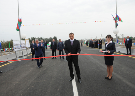 Президент Ильхам Алиев разрезал ленту в знак открытия моста.