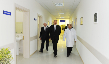 Президент Ильхам Алиев разрезал ленту в знак открытия поликлиники, ознакомился с созданными здесь условиями.
