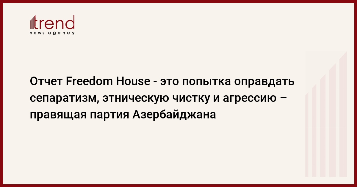 "Считаю, что такой подход дает достаточно серьезные основания сомневаться в объективности этой организации. Считаю необходимым отметить, что указание в отчете Freedom House "Нагорного Карабаха" как отдельной структуры следует расценивать как попытку оправдать сепаратизм, этническую чистку и агрессию. Подобные попытки препятствуют усилиям ООН и ОБСЕ и их политике по урегулированию армяно-азербайджанского нагорно-карабахского конфликта, служат усилению напряжения и противостояния в регионе. Азербайджанская общественность всегда справедливо выражала протест против необъективных оценок предвзятых международных организаций. Верю, что последний отчет Freedom House является еще более серьезным основанием для протеста азербайджанского народа. Кстати, хотелось бы отметить, что иногда радикальное крыло оппозиции с удовольствием берет на себя роль пропагандиста предвзятых организаций, порочащих Азербайджан. Считаю это отвратительной формой политической борьбы. Поддерживать позицию организации, признающей режим вымышленного "Нагорного Карабаха", включающей его в свой предвзятый и необъективный отчет, не что иное, как попрание национальных интересов", - подчеркнул зампредседателя ПЕА.