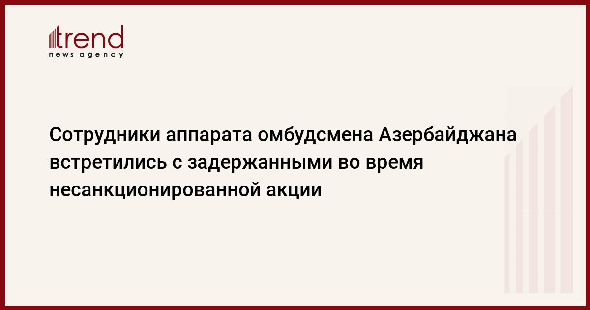 Сотрудники аппарата встретились с лицами, задержанными во время несанкционированной акции 26 января, ознакомились с условиями содержания и обращения с ними, а также документами, подтверждающими правомерность их задержания, сообщили в понедельник Trend в пресс-службе аппарата омбудсмена.