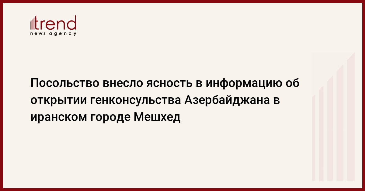 Посольство Азербайджана в Иране заявило, что сообщения иранской прессы об открытии генконсульства Азербайджана в городе Мешхед, которые даны со ссылкой на посла Азербайджана Джеваншира Ахундова, не соответствуют действительности, сообщили в среду Trend в посольстве Азербайджана в Иране.
