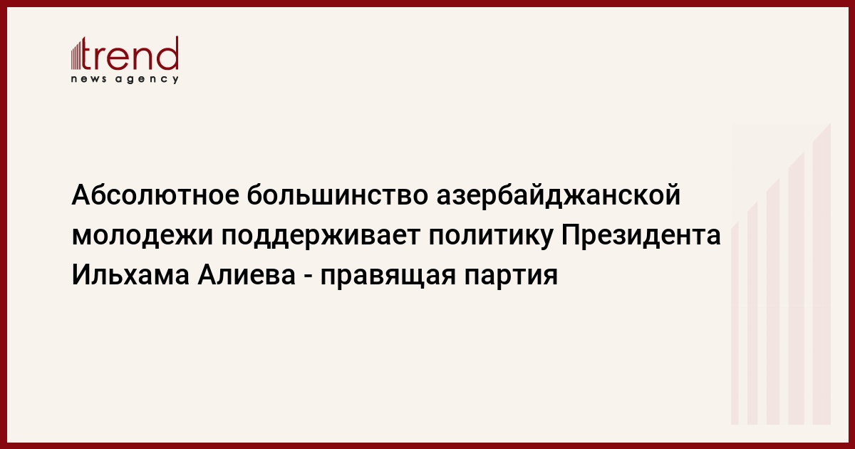 Абсолютное большинство азербайджанской молодежи поддерживает политику, проводимую Президентом Ильхамом Алиевым, сказал Trend во вторник председатель Объединения молодежи правящей партии "Ени Азербайджан" (ПЕА) Сеймур Оруджев.