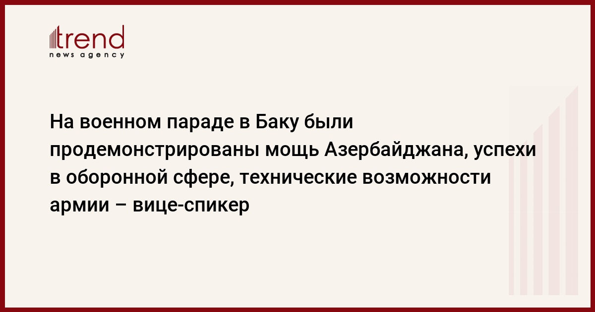На военном параде, проведенном в Баку в связи с 95-летием создания Вооруженных сил Азербайджана, были продемонстрированы мощь страны, успехи, достигнутые в оборонной сфере, технические возможности армии. Об этом сказала в среду Trend заместитель председателя Милли Меджлиса (парламента) Азербайджана Бахар Мурадова.