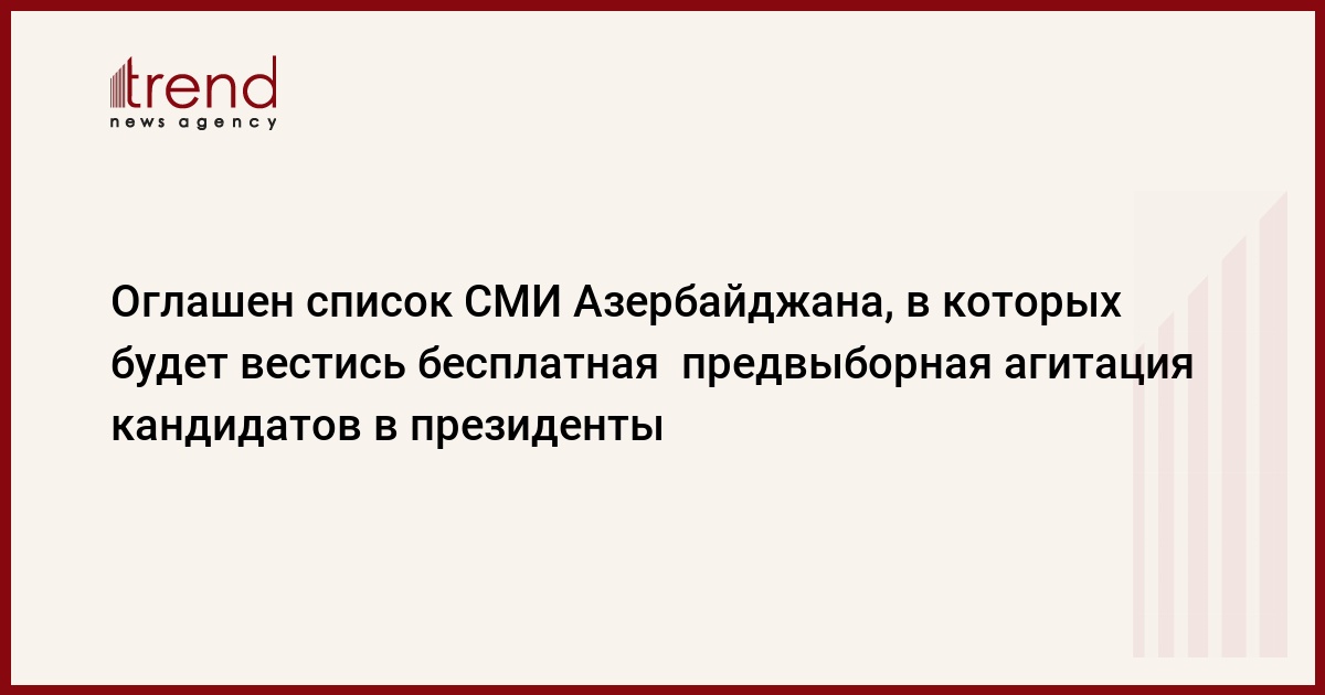 Согласно сообщению, бесплатное эфирное время будет выделено кандидатам на телеканале компании "Общественное телевидение и радиовещание", а места для публикаций - в газетах "Азербайджан", "Халг газети", "Республика" и "Бакинский рабочий".