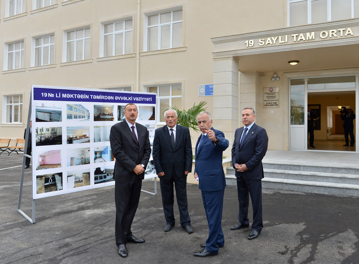 Глава Исполнительной власти города Баку Гаджибала Абуталыбов проинформировал главу государства о проделанной работе. Отмечалось, что первый корпус школы, сданной в эксплуатацию в 1964 году, является трехэтажным, а второй - одноэтажным. В 2006 году с целью устранения нехватки ученических мест был построен новый корпус, состоящий из дополнительных классных комнат на 400 мест. В школе на 1600 ученических мест в настоящее время обучаются 1417 детей. Все классные комнаты, четыре кабинета информатики, кабинеты химии, физики, биологии, зал заседаний, открытая и закрытая спортивные площадки капитально реконструированы. Школа оснащена современным оборудованием. На территории 8 гектаров проведено благоустройство.