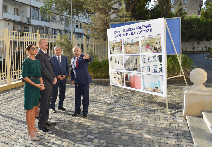 Глава Исполнительной власти города Баку Гаджибала Абуталыбов проинформировал главу государства о проделанной работе. Было сообщено, что здание полной средней школы номер 158 построено в 1961 году. Школа на 1850 ученических мест состоит из трех учебных корпусов и одного подсобного здания. Работа по капитальному ремонту и реконструкции началась в мае этого года, и за короткий срок были отремонтированы все классные комнаты, предметные кабинеты, столовая, библиотека, актовый и спортивный залы школы, здесь созданы условия, соответствующие высоким стандартам. Осветительная и отопительная системы учебного заведения также реконструированы. На территории проделана работа по благоустройству и озеленению.