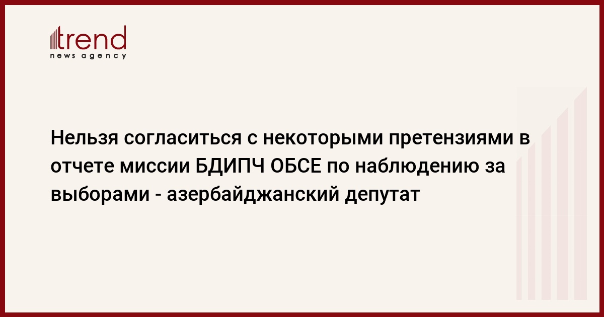 Нельзя согласиться с некоторыми претензиями, которые содержатся в первом промежуточном отчете миссии Бюро по демократическим институтам и правам человека ОБСЕ (БДИПЧ ОБСЕ) по наблюдению за президентскими выборами в Азербайджане, сказал во вторник Trend депутат Айдын Мирзазаде.