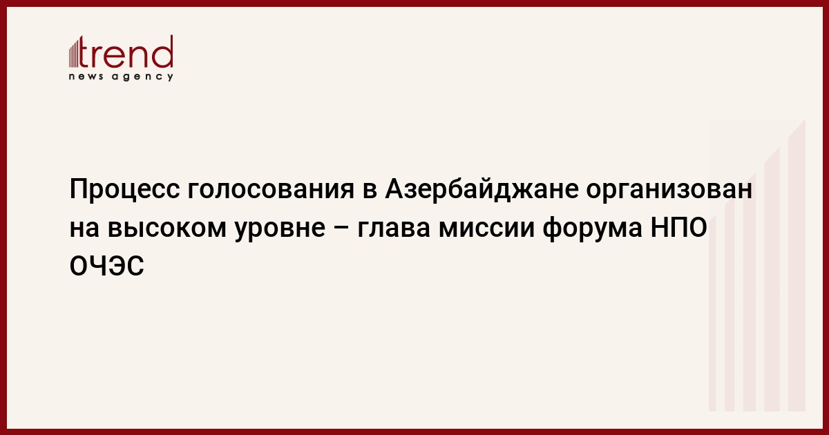 Процесс голосования на выборах президента Азербайджана на избирательных участках столицы организован на достаточно высоком уровне, сказал Trend в среду глава наблюдательной миссии форума НПО Организации Черноморского экономического сотрудничества, глава группы наблюдателей ОЧЭС за ходом президентских выборов в Азербайджане Исмаил Сафи.