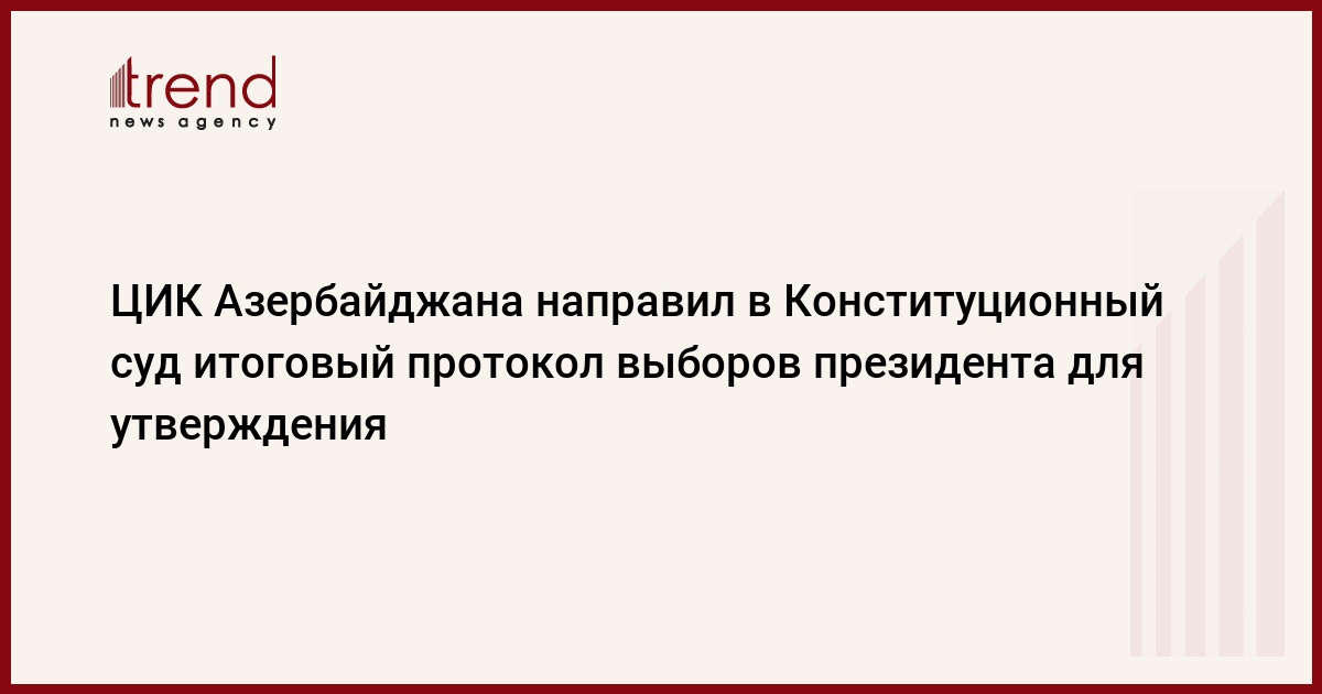 Центральная избирательная комиссия (ЦИК) Азербайджана направила в Конституционный суд итоговый протокол президентских выборов, прошедших девятого октября, для их утверждения. Решение об этом было принято на заседании ЦИК в четверг.