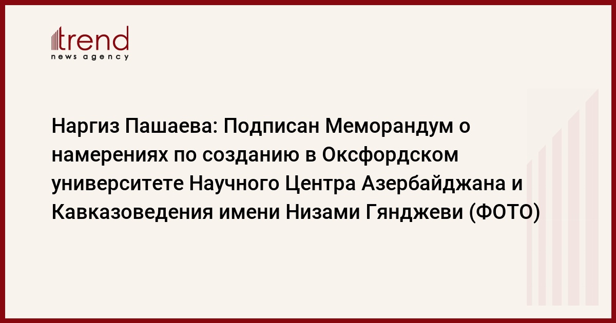 Во время визита профессор Наргиз Пашаева подписала важный документ - Меморандум о намерениях по созданию в Оксфордском университете Научного Центра Азербайджана и Кавказоведения имени Низами Гянджеви. Документ был подписан с директором по международному развитию Оксфордского университета Лиейзл Элдер.