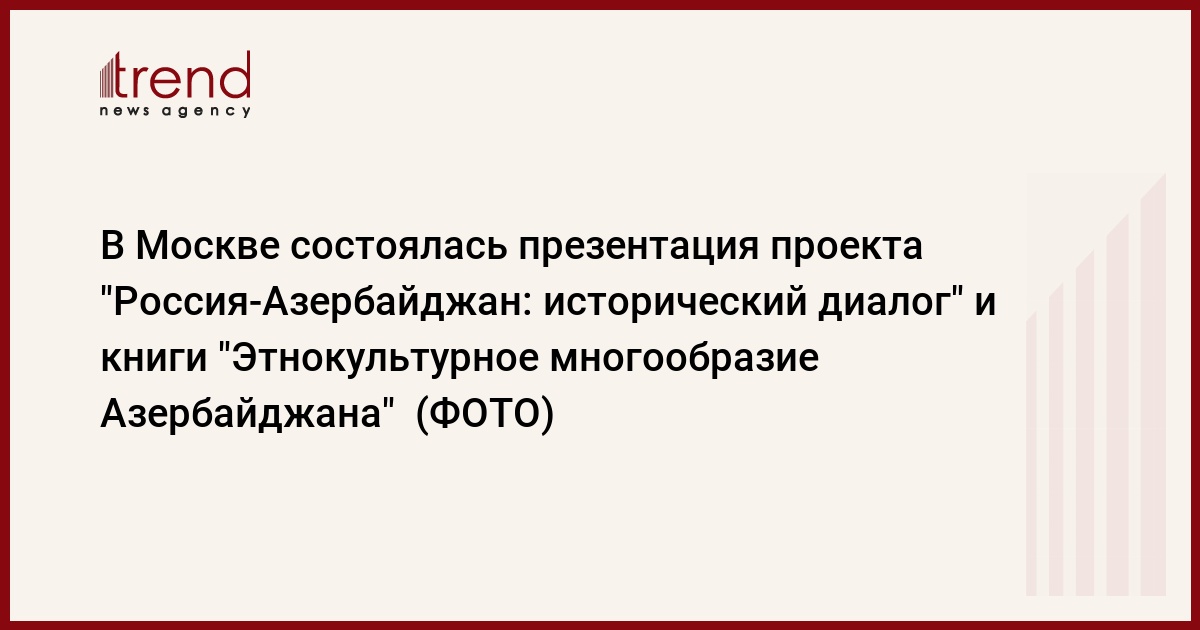 В Москве в среду, в Центре восточной литературы Российской государственной библиотеки состоялась презентация международного проекта "Россия-Азербайджан: исторический диалог" и книги кандидата философских наук, члена Российского философского общества Российской академии наук, научного консультанта Ариельского университета Израиля Германа Захарьяева "Этнокультурное многообразие Азербайджана", изданного к 90-летию общенационального лидера Азербайджана. Издание подготовлено Российским философским обществом РАН и вышло в свет в издательском доме "Достоинство". Презентация книги была организована российским представительством Фонда Гейдара Алиева, Всероссийским Азербайджанским Конгрессом, Национальной Академией наук Азербайджана, Российской Академией наук и благотворительным фондом СТМЭГИ, сообщает АзерТАдж.