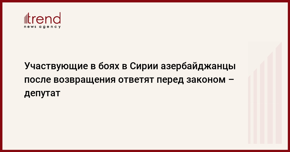 Азербайджанцы, уехавшие в Сирию для того, чтобы принять участие в боях в этой стране, должны будут ответить перед законом после возвращения на родину. Об этом сказала в субботу журналистам председатель комитета по правам человека Милли Меджлиса (парламента) Азербайджана Рабият Асланова.