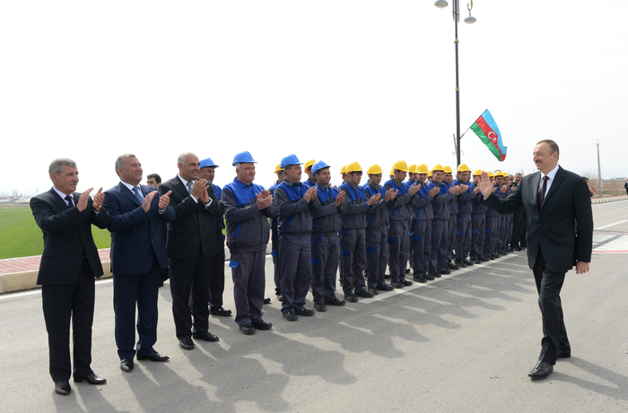 Президент Ильхам Алиев разрезал ленту в знак открытия дороги, сев за руль автомобиля, проехал по новой магистрали.