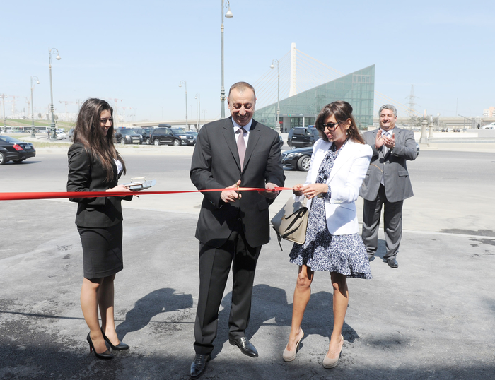 Президент Ильхам Алиев и его супруга Мехрибан Алиева разрезали ленту в знак открытия Национальной гимнастической арены.