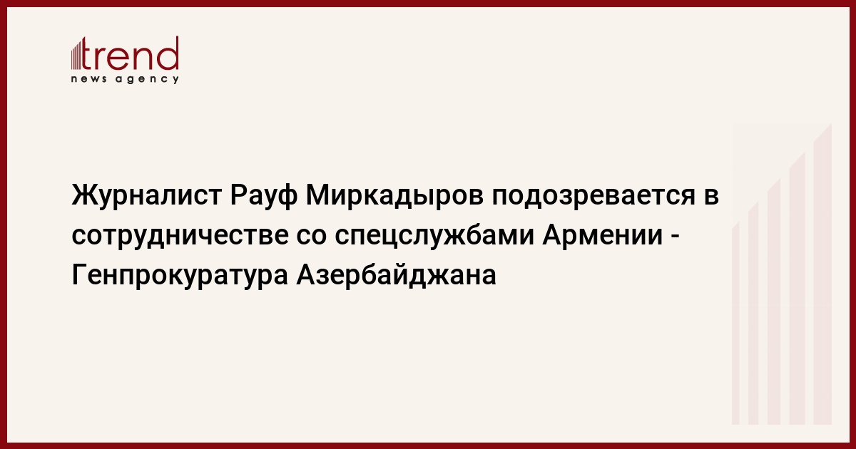 Гражданин Азербайджана журналист Рауф Хабибулла оглу Миркадыров подозревается в сотрудничестве со спецслужбами Армении с апреля 2008 года и неоднократных встречах на территории Армении, Грузии и Турции и передаче по их поручению информации о ситуации в общественно-политической и военной сферах, в том числе представляющей государственную тайну, вместе фотографиями и схемами для использования в проведении враждебной деятельности в отношении Азербайджана. Его действия были направлены против суверенитета, государственной безопасности, территориальной целостности и обороноспособности Азербайджана.