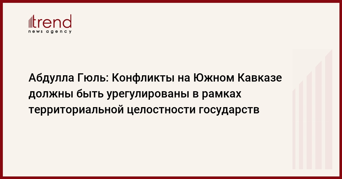 Конфликты на Южном Кавказе должны быть урегулированы в рамках территориальной целостности государств. Об этом сказал во вторник Президент Турции Абдулла Гюль на пресс-конференции в Тбилиси, состоявшейся по итогам саммита, в котором приняли участие президенты Азербайджана, Турции и Грузии, сообщает спецкор Trend.