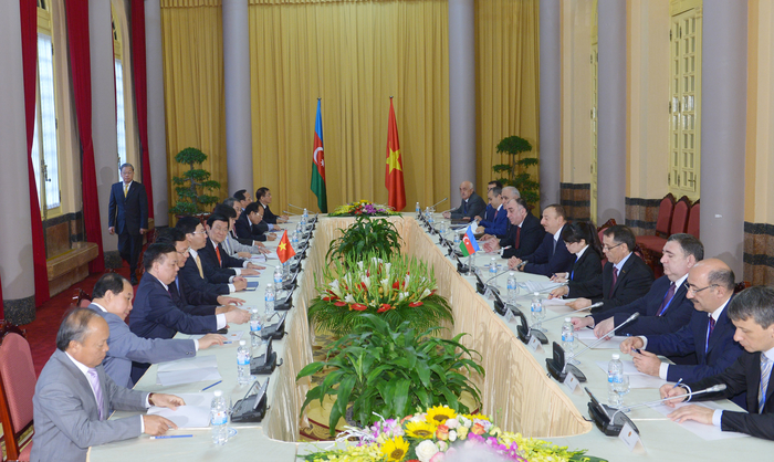 После завершения встречи в узком составе в понедельник состоялась встреча Президента Азербайджана Ильхама Алиева и Президента Вьетнама Чыонга Тана Шанга в расширенном составе с участием делегаций.