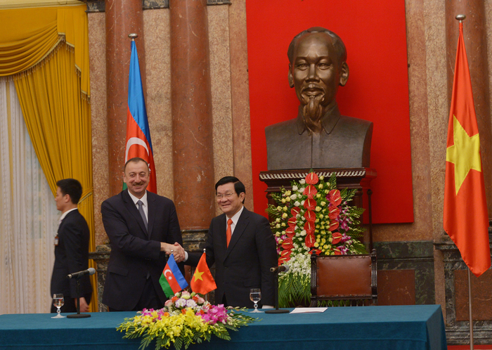 "Стороны должны продолжать эту деятельность, имеющую позитивную тенденцию, увеличивать число взаимных визитов делегаций, особенно на высшем уровне, эффективно претворять в жизнь подписанные ранее соглашения, а также подписанные чуть ранее важные документы о сотрудничестве. Мы обсудили и согласовали с господином Президентом вьетнамо-азербайджанские связи, в частности, меры по их развитию в торгово-экономической и инвестиционной сферах. Мы пришли к такому выводу, что сторонам необходимо развивать сильные направления, а также увеличивать товарооборот, в том числе, предпринимать активные шаги в нефтегазовом секторе, считая его приоритетным, стратегическим и долгосрочным направлением. Азербайджан и Вьетнам будут оказывать содействие деловым кругам обеих стран в области обмена информацией, налаживания прямых связей и поиска форм плодотворного сотрудничества. Вьетнам готов создавать благоприятные условия азербайджанским предпринимателям для вложений инвестиций в такие перспективные отрасли, как банковское дело, недвижимость, туризм, легкая промышленность", - заявил Чыонг Тан Шанг.