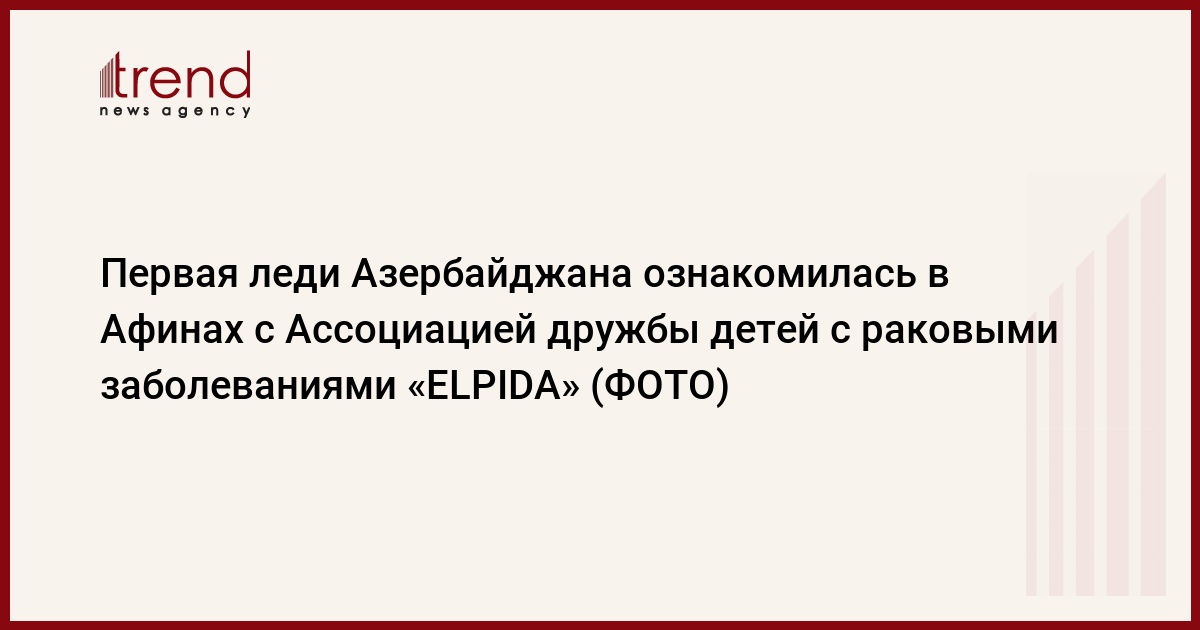 БАКУ /Trend/ - В рамках государственного визита Президента Ильхама Алиева в Грецию, 15 июня первая леди Азербайджана Мехрибан Алиева ознакомилась в Афинах с Ассоциацией дружбы детей с раковыми заболеваниями "ELPIDA".