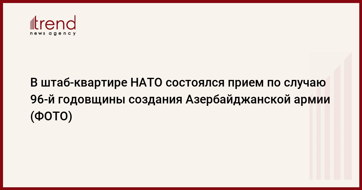 БАКУ /Trend/ - В штаб-квартире НАТО в Брюсселе представительство Азербайджана при НАТО и военное представительство ВС Азербайджана при Военном комитете НАТО провели официальный прием по случаю 96-й годовщины создания Азербайджанской армии, сообщили в пятницу Trend в представительстве.