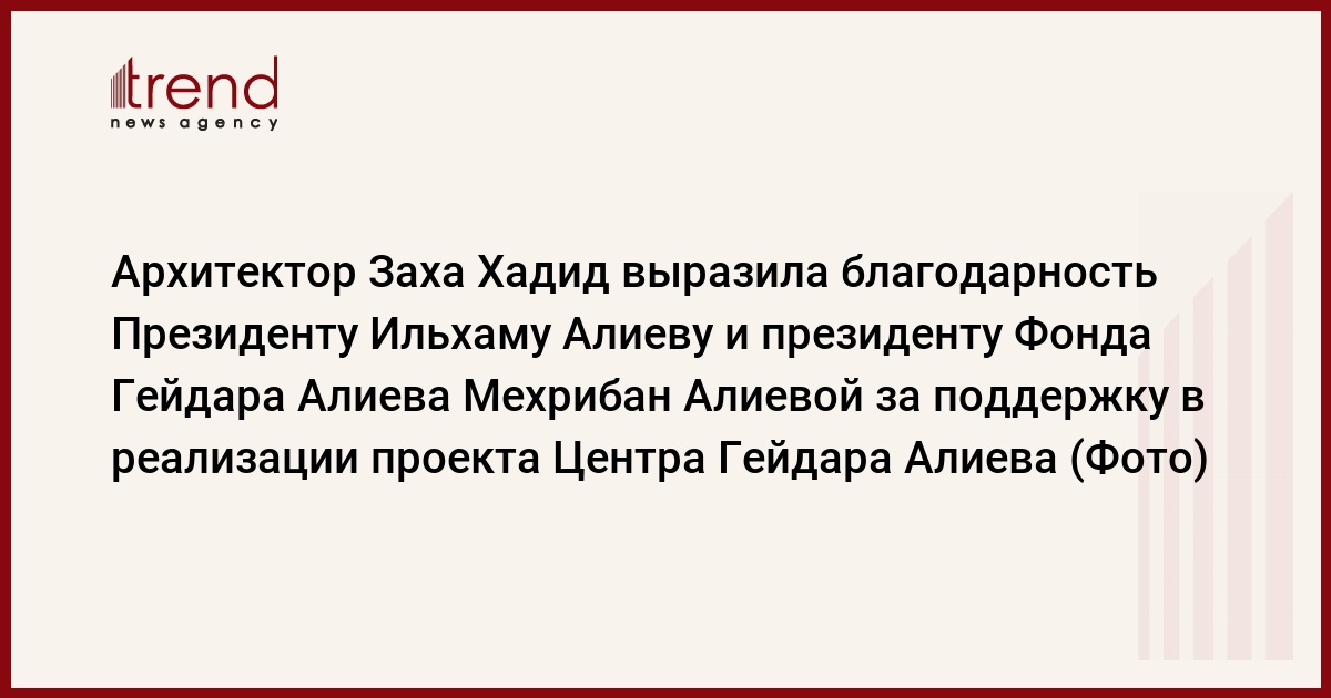 Выступившая на церемонии автор проекта Центра Гейдара Алиева, всемирно известный архитектор Заха Хадид выразила благодарность Президенту Азербайджана Ильхаму Алиеву и президенту Фонда Гейдара Алиева Мехрибан Алиевой за поддержку в реализации проекта этого образца архитектуры.