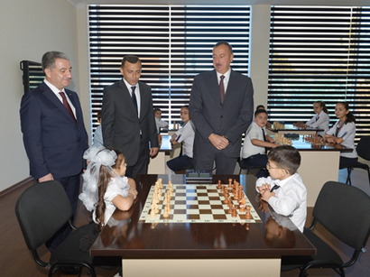 БАКУ /Trend/ - Президент Азербайджана Ильхам Алиев в рамках поездки в Бейляганский район в четверг принял участие в открытии шахматной школы.