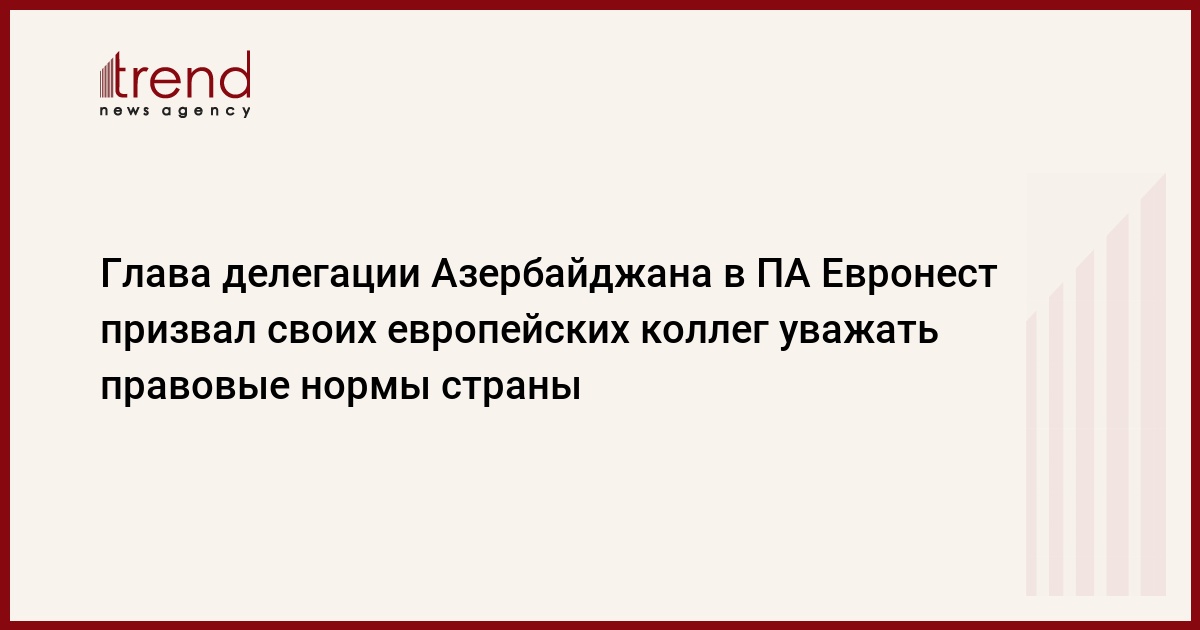 БАКУ /Trend/ - Председатель азербайджанской делегации в ПА Евронест Эльхан Сулейманов призвал своих европейских коллег уважать правовые нормы Азербайджана, в частности правомерность уголовного дела в отношении Лейлы Юнус, а также занять справедливую позицию по вопросу продолжающейся армянской оккупации Нагорного Карабаха и прилегающих территорий, сообщает сайт PR Newswire.