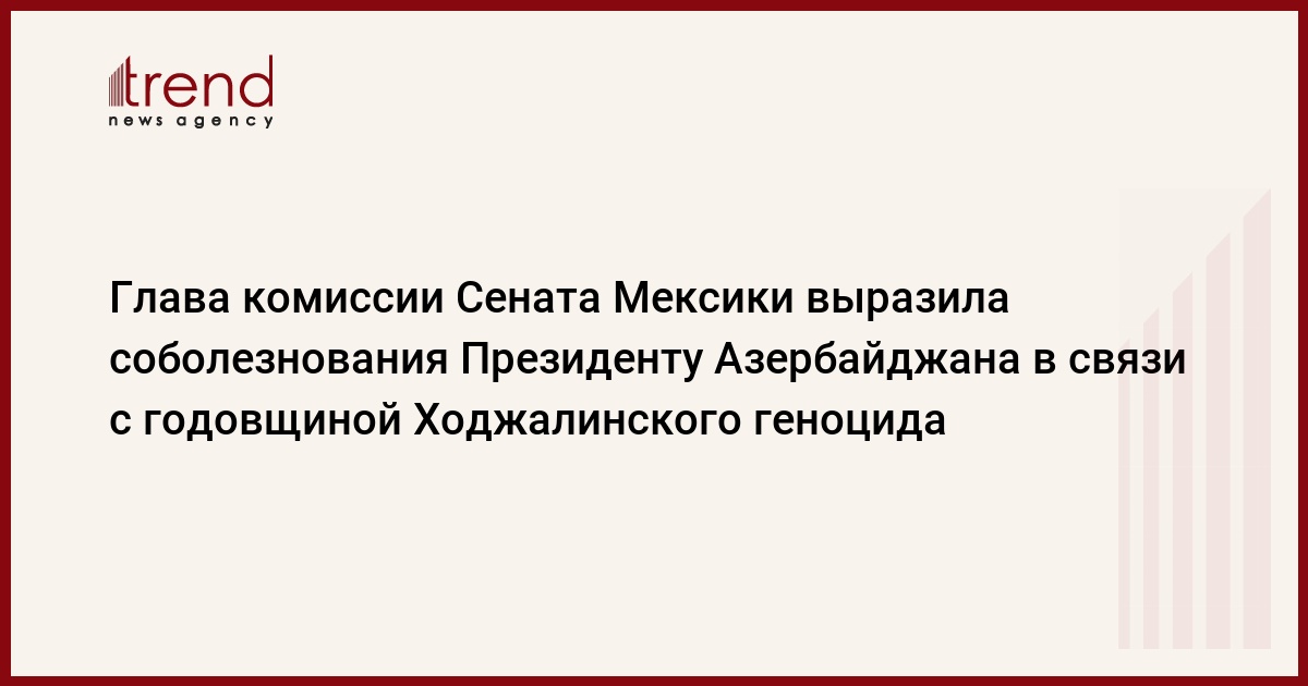 БАКУ /Trend/ - Председатель Комиссии по внешним связям Сената Мексики сенатор Габриэла Куэвас Барон выразила соболезнования Президенту Азербайджана Ильхаму Алиеву.
