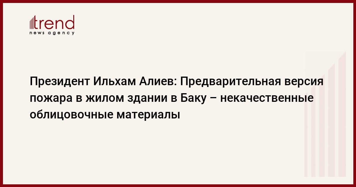 Затем Президент Ильхам Алиев рассказал о принимаемых на государственном уровне мерах по устранению последствий пожара. Глава государства сказал, что в отношении лиц, виновных в случившемся, возбуждено уголовное дело, и они будут строго наказаны. Президент Ильхам Алиев отметил, что предварительная версия пожара - облицовка здания некачественными и неогнестойкими материалами. Подчеркнув, что в настоящее время в столице достаточно много зданий, облицованных аналогичными материалами, глава государства дал конкретные указания Исполнительной власти города Баку и Министерству по чрезвычайным ситуациям провести экспертизу в зданиях, облицованных аналогичными материалами, изучить состав этих материалов, в случае, если есть опасность, немедленно демонтировать облицовку данных зданий.