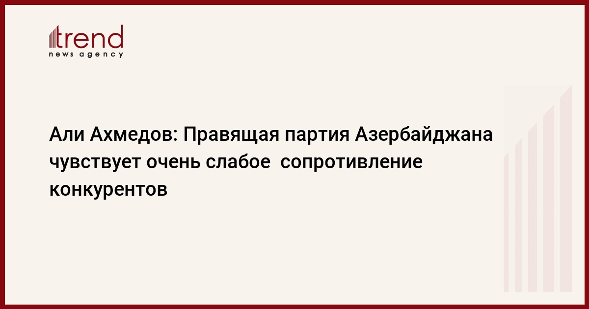 "На фоне очень большой моральной и политической силы в обществе партии, в которой я представлен, мы чувствуем очень слабое сопротивление конкурентов. До сегодняшнего дня наши оппоненты не смогли определить конкретных целей. Единственную задачу политической деятельности они видят в клевете и не стесняются наносить удары по национальным интересам. Ничего позитивного они обществу пообещать не могут и превратились в носителей негативной энергетики. Оппозиция расшатана, расколота и расчленена. Роли оппозиции в политической жизни Азербайджана практически не видно. Сегодня оппозиция, в особенности ее агрессивная часть, видит политическую борьбу и политическую активность в сотрудничестве с различными группами за пределами Азербайджана. Но самое плачевное то, что эти группы, как правило, никогда не скрывают своей антиазербайджанской позиции. В результате это крыло оппозиции по сути превращается в антиазербайджанский элемент. Ее еще называют "пятой колонной". Абсолютно ясно, что те, кто противопоставляет свои интересы интересам народа, не могут надеяться на поддержку народа. Поэтому причину неучастия некоторых оппозиционных кругов в выборах надо искать в этом", - подчеркнул Али Ахмедов.