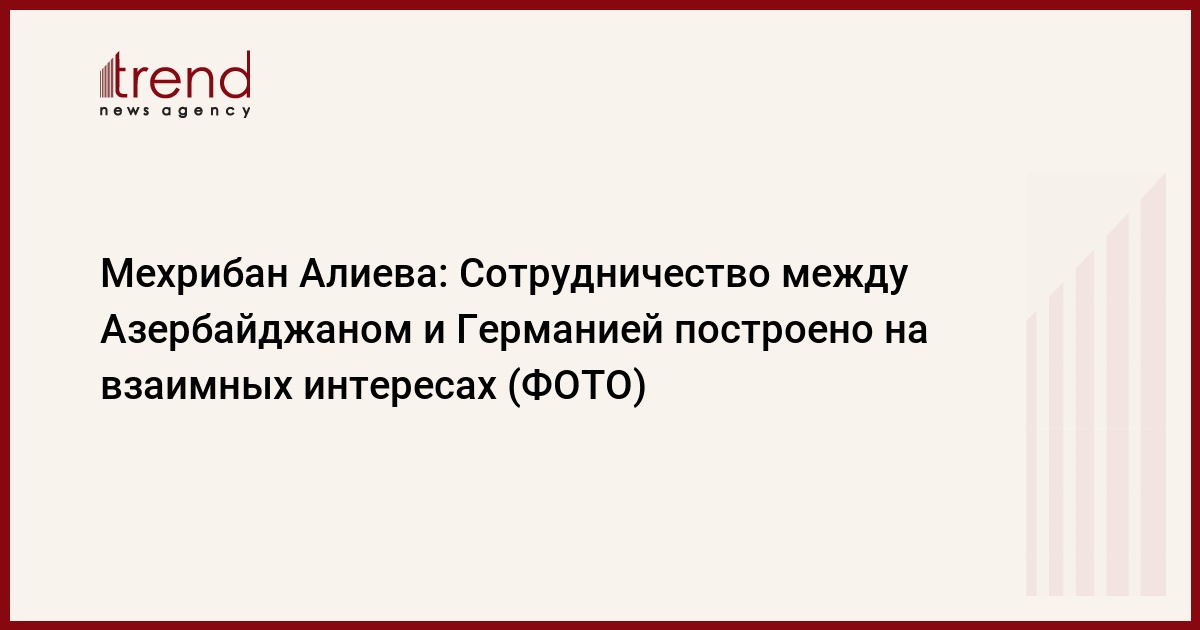 Первая леди Мехрибан Алиева сказала, что Азербайджан заинтересован в развитии связей с Германией, как одной из ведущих европейских стран. Она подчеркнула, что сотрудничество между нашими странами построено на взаимных интересах. Отметив, что есть хороший потенциал для развития отношений наших стран и в гуманитарной сфере, Мехрибан Алиева выразила готовность Фонда Гейдара Алиева проделать еще большую работу в этой сфере. Напомнив о реализации Фондом Гейдара Алиева ряда проектов в Германии, первая леди Азербайджана отметила, что эти проекты были встречены с большим интересом, имеются широкие возможности для сотрудничества в гуманитарной сфере.