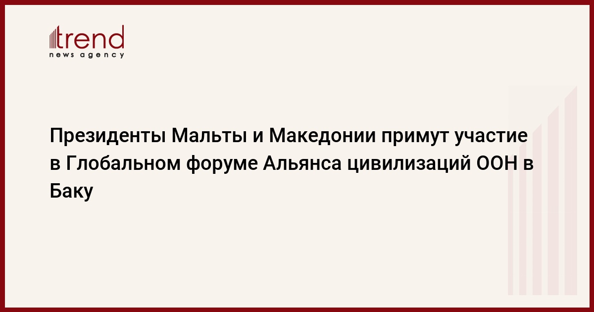 БАКУ /Trend/ - Президент Мальты Мари-Луиз Колейро Прека и президент Македонии Георге Иванов прибудут в Баку для участия в VII Глобальном форуме Альянса цивилизаций ООН, который состоится 25-27 апреля, сообщили Trend в субботу в министерстве культуры и туризма Азербайджана.
